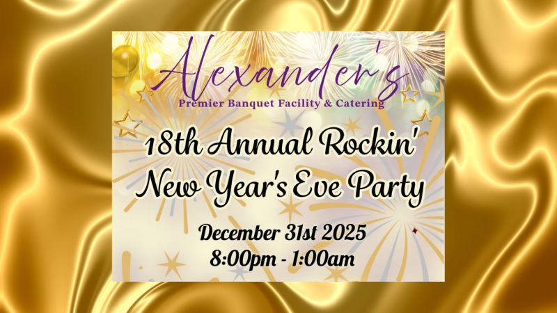 Welcome to ALEXANDER'S 17th ANNUAL NEW YEARS EVE BASH! Join us for a night of fun and celebration at Alexander's Premier Banquet Facility and Catering. Get ready to dance, eat, and ring in the new year with friends and family. This in-person event promises to be the highlight of your year. Don't miss out on the party of the year - mark your calendars now!