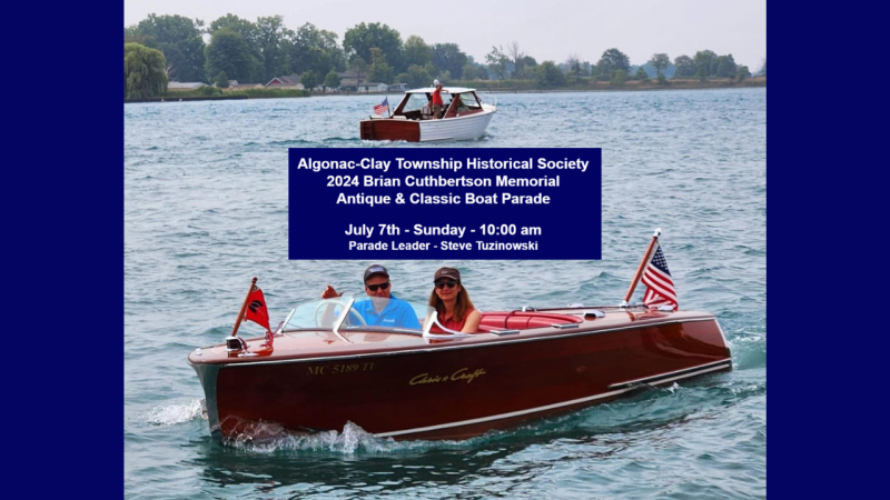 This year's parade features an extend route starting from the Pearl Beach Pier at Lega's and ending at the ACHS Community Museum at north end of Algonac Riverfront Park (Boardwalk). Mainland North Channel Residents will have excellent viewing from their docks. Community Spectators best viewing areas are all along the Algonac Riverfront Park from the Seafarers Union to the Community Museum. The Algonac Riverfront Park will also be hosting a Classic Car show on the same day, so visitors will experience both Classic Cars and Antique Boats.