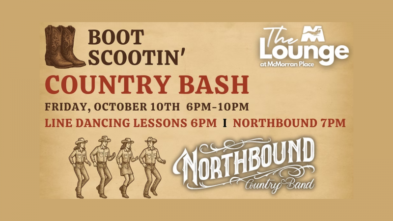 Join us for the Boot Scootin’ Country Bash on Friday, October 10 in the McMorran Lower Level Lounge! The night kicks off with line dancing led by Chance to Dance from 6–7 PM, followed by live music from Northbound Country Band from 7–10 PM. The bar will be open, admission is free, and the dance floor is waiting—so grab your boots, bring your friends, and get ready for a night of country fun in Port Huron!