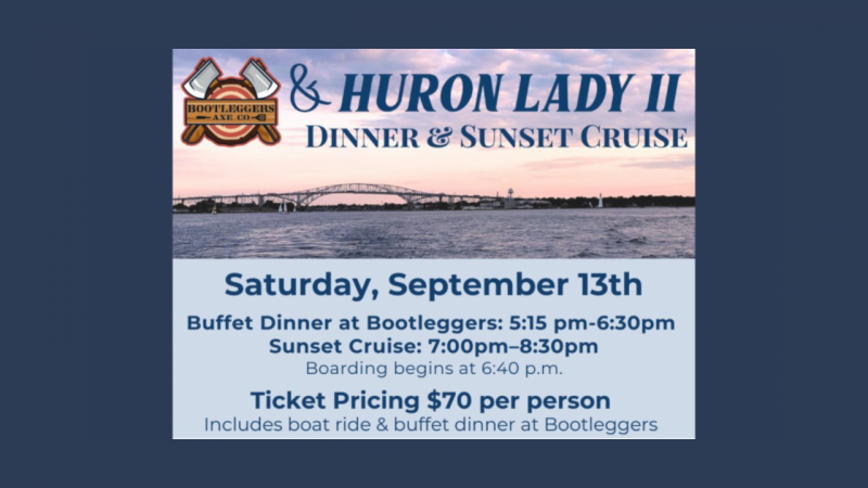 Join us Saturday, September 13th for a Dinner & Sunset Cruise aboard the Huron Lady II.