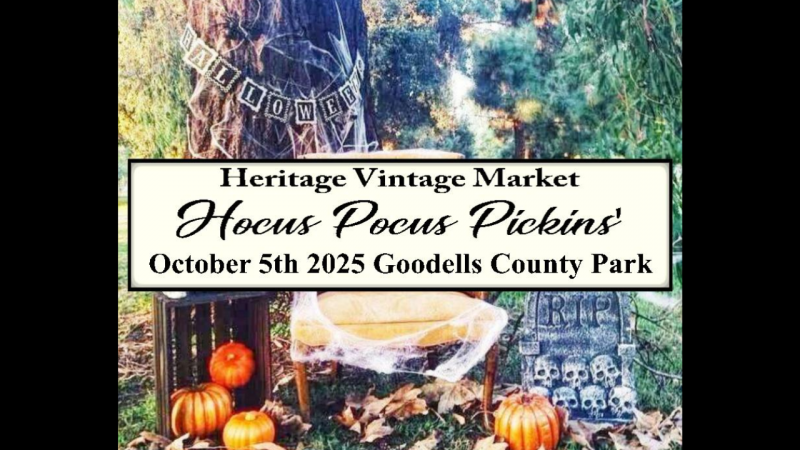 OCTOBER 5TH, 11A TO 4P for a spellbinding day of enchantment and nostalgia at the Heritage Vintage Market, nestled within the picturesque setting of Goodells County Park 8201 LAPEER RD in Goodells, Michigan. Prepare to be bewitched by the charm of Hocus Pocus Pickins' on OCTOBER 5TH, 2025!