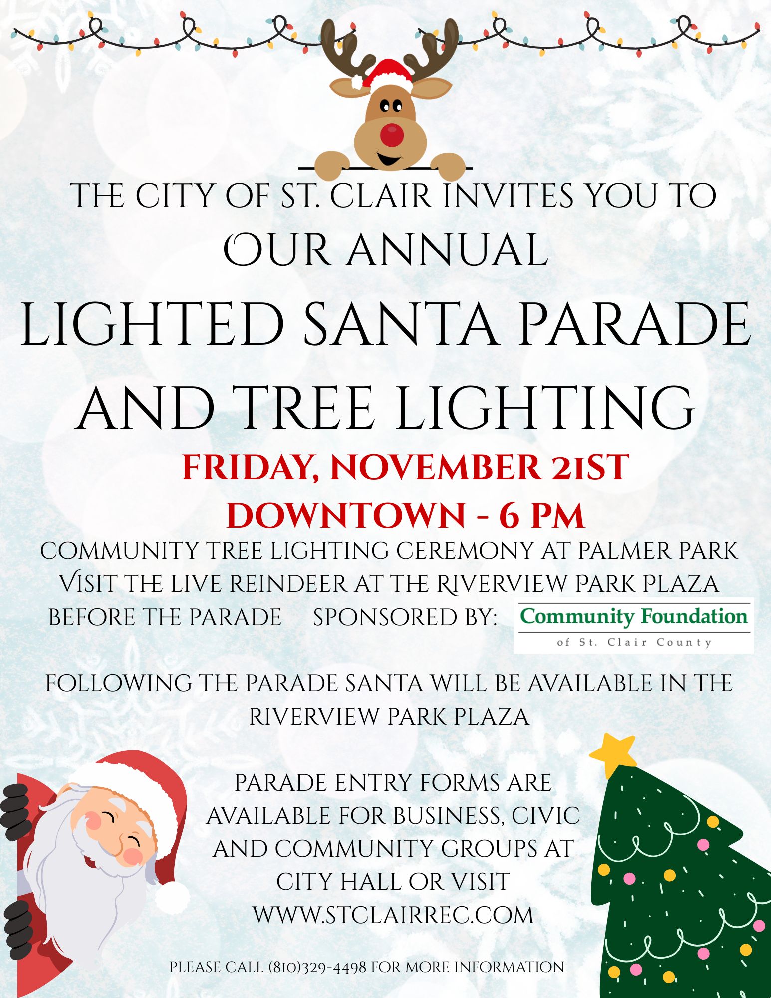 Visit St. Clair's annual Lighted Santa Parade and welcome Santa Claus with a key to the City. Santa will then lead the crowd in counting down the Community Tree Lighting. Afterwards, stay downtown to visit with Santa Claus himself and the Live Reindeer in the Candy Cane Corral. The parade will go down River Rd. along Palmer Park.