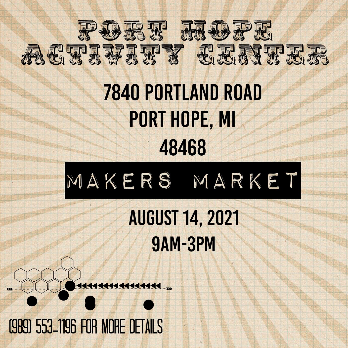 Rain or shine, join us at the Port Hope Activity Center for the PH Makers Market! Local artists, creators & crafters will sell their creations, along with a lunch option and restrooms for the public. Located just a half mile off M-25 with views to Lake Huron. It's the "Little Town with the Big Welcome".