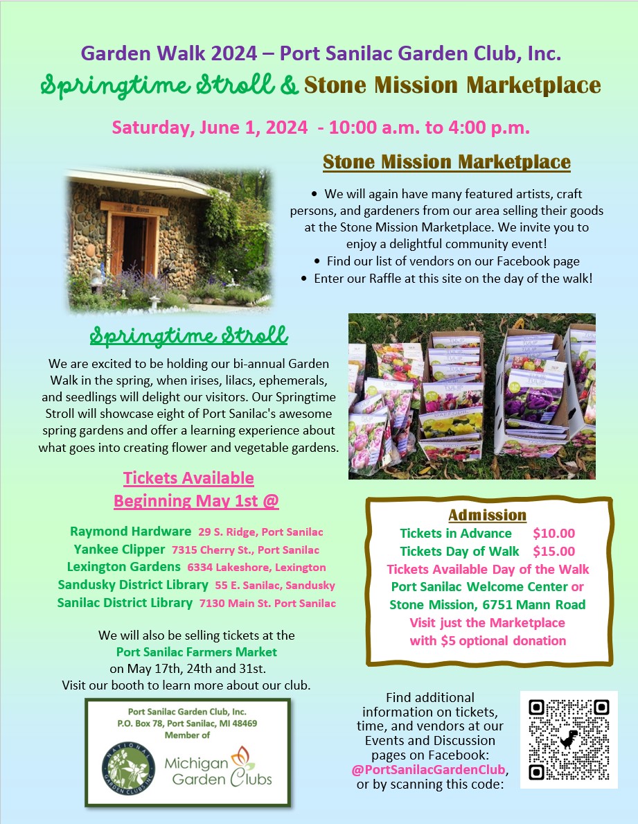 The Port Sanilac Garden Club is excited to be holding our bi-annual Garden Walk in the spring, when irises, lilacs, ephemerals, and seedlings will delight our visitors. Our Springtime Stroll will showcase eight of Port Sanilac's awesome spring gardens and offer a learning experience about what goes into creating flower and vegetable gardens.