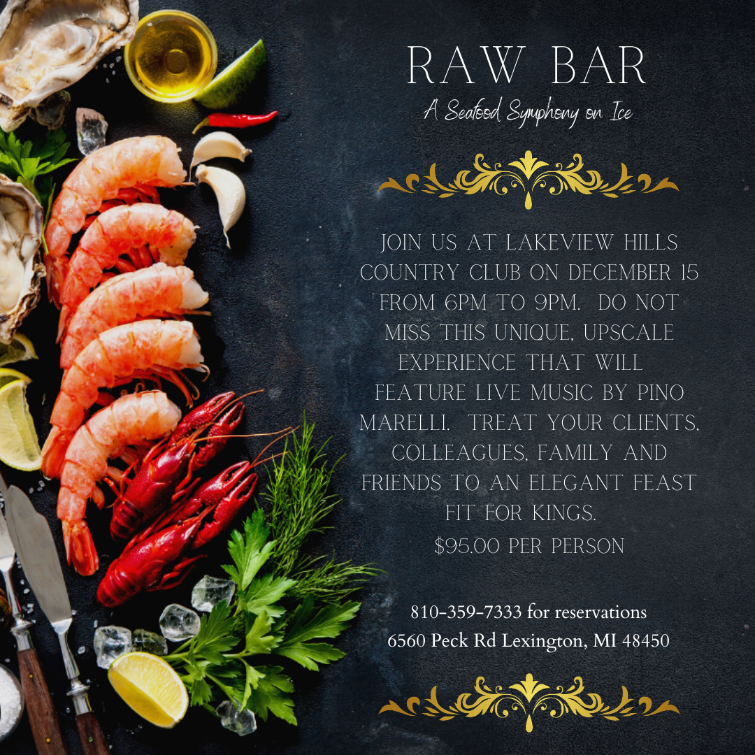 Join us at Lakeview Hills for our first annual Raw Bar on December 15th from 6pm to 9pm. We will have live dinner music and a feast fit for kings. Don't miss this last chance to wine and dine colleagues and friends in style before the hustle and bustle of the holidays. For reservations call 810-359-7333 or email at bherrick@lakeviewhills.com