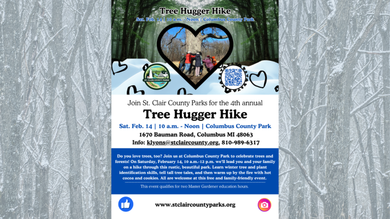Join the St. Clair County Parks staff to explore the trees of the rustic and rolling Columbus County Park on Saturday, February 14, from 10:00 a.m. to 12:00 p.m. Meet in front of the Lodge. Learn to use your senses to identify trees and plants in winter, discuss how to care for trees and shrubs this time of year, and bring awareness to the threats that local forests face. Discover what trees can tell us about a landscape, and share your own stories of trees and forests. Jennifer Catanzaro, St. Clair County Parks Marketing and Graphic Design Coordinator said, “This is a great way for nature lovers, children and families to celebrate Valentine’s Day – with trees! We hope you’ll join us for some fun in the forest.” Enjoy warming up with hot cocoa and cookies by the fire after the hike. All are welcome at this free and family-friendly event. Pre-registration is recommended, contact Kirsten Lyons, klyons@stclaircounty.org, (810) 989-6317. Watch the St. Clair County Parks and Recreation Commission Facebook page for updated information about this event and in case of severe weather. The program will be moved indoors if conditions warrant.