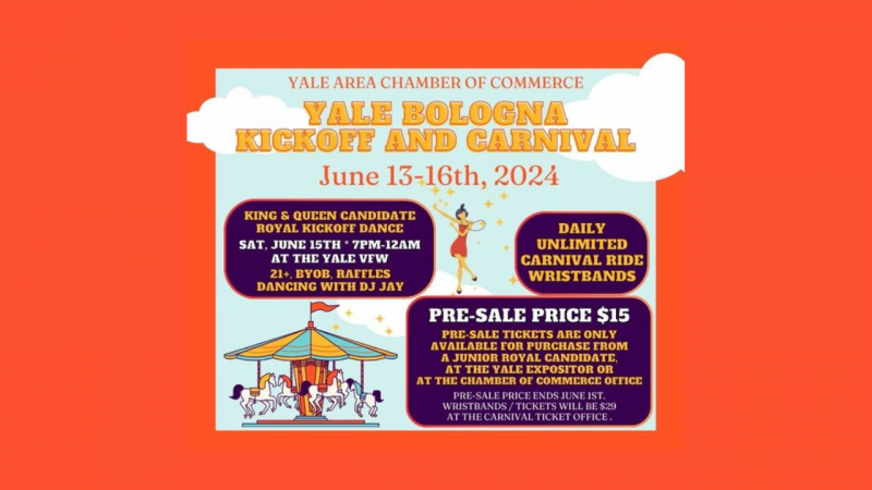 ***Pre-sale tickets can be purchased for only $15 at the Chamber of Commerce, Yale Expositor and from Junior Royal Candidates. This ticket is redeemed for an all-day ride wristband ($29 value) at the carnival box office.