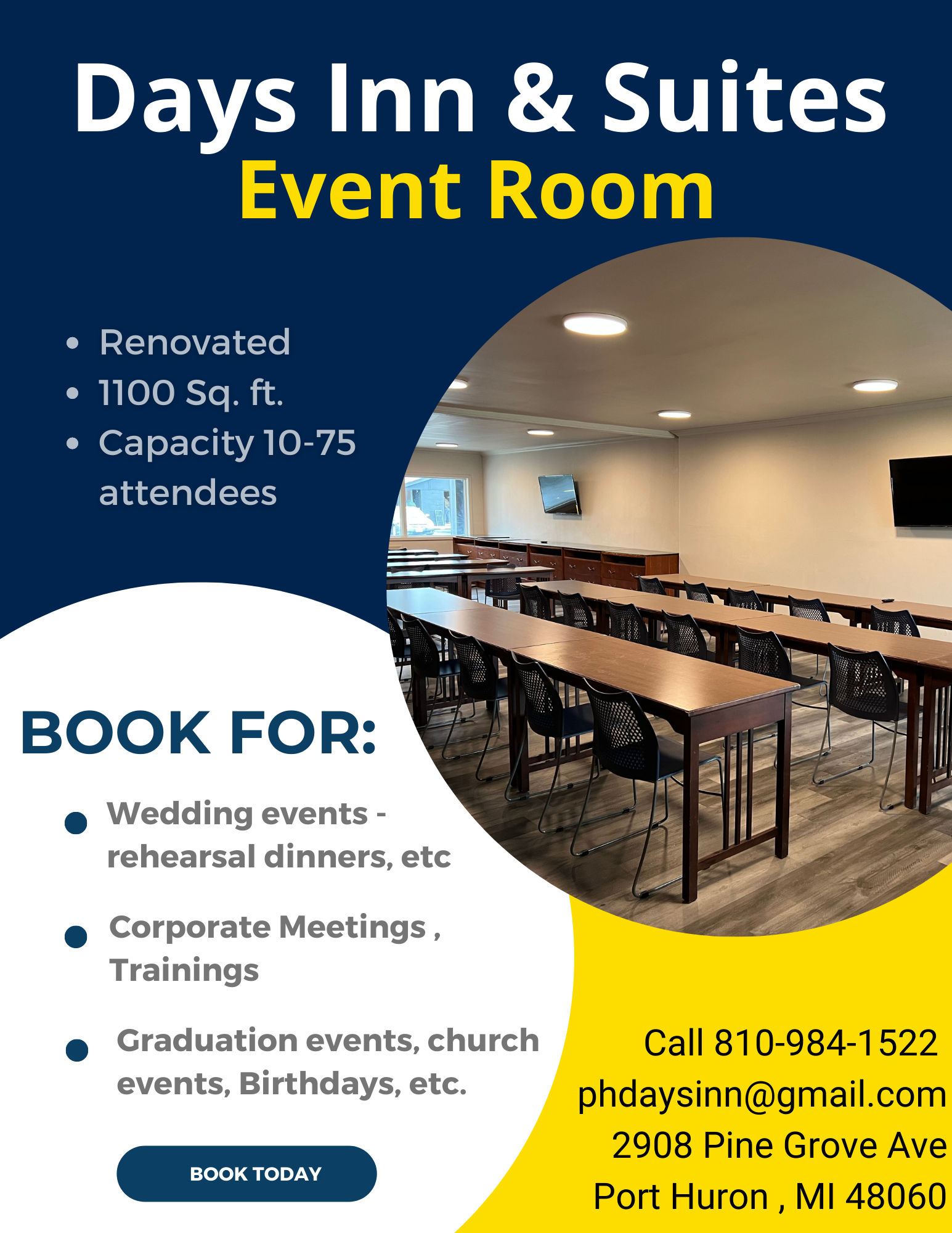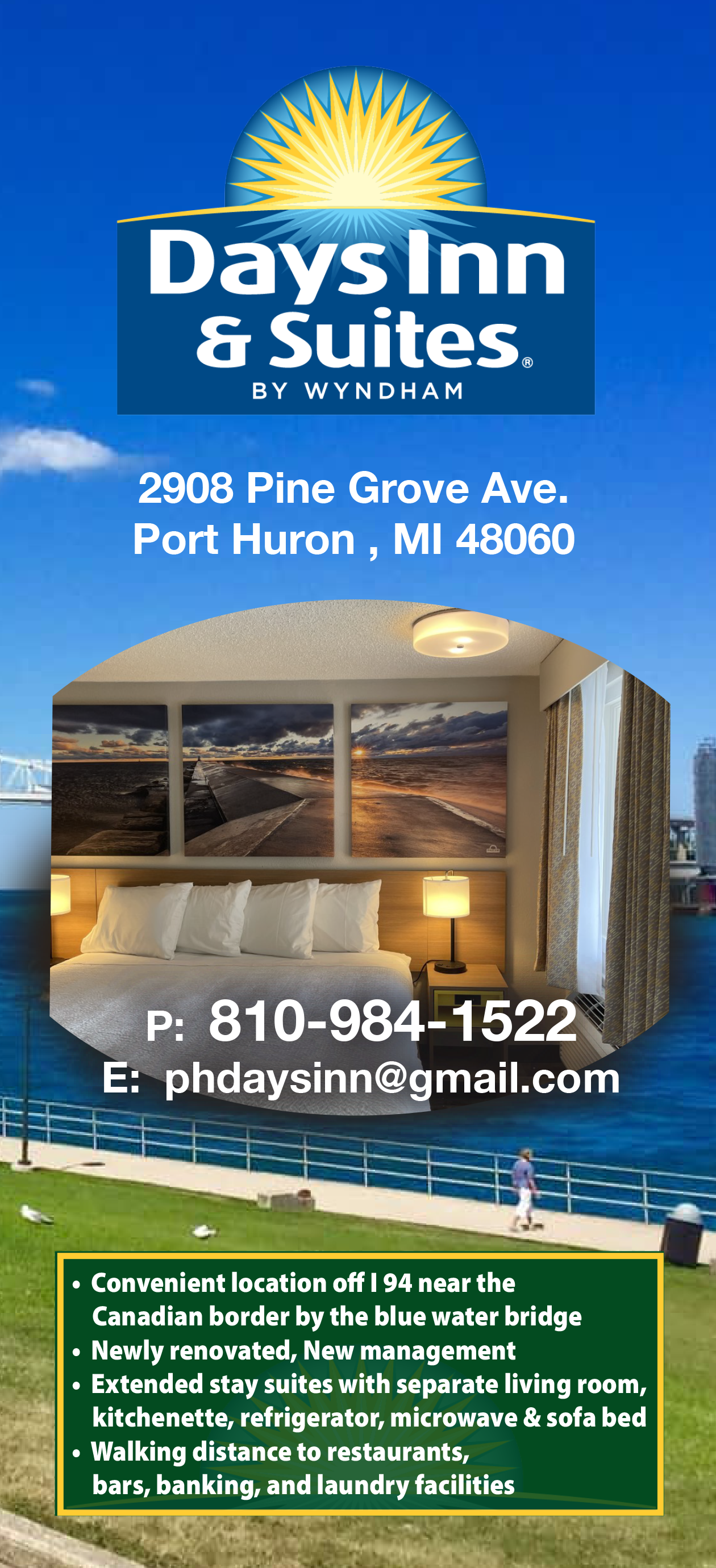 Explore this historic city on Lake Huron and the St. Clair River while enjoying free continental breakfast, parking, and Wi-Fi at Days Inn & Suites by Wyndham Port Huron. Admire sunset views on the Canadian border from Blue Water Bridge, tour the Huron Lightship Museum, or stroll along Blue Water River Walk. Surrounded by bars and restaurants, we’re within easy reach of St. Clair County Community College, St. Clair County Library, and Port Huron Hospital. Our contemporary, non-smoking hotel is off I-94, 81 miles from Detroit Metropolitan Wayne County Airport (DTW).