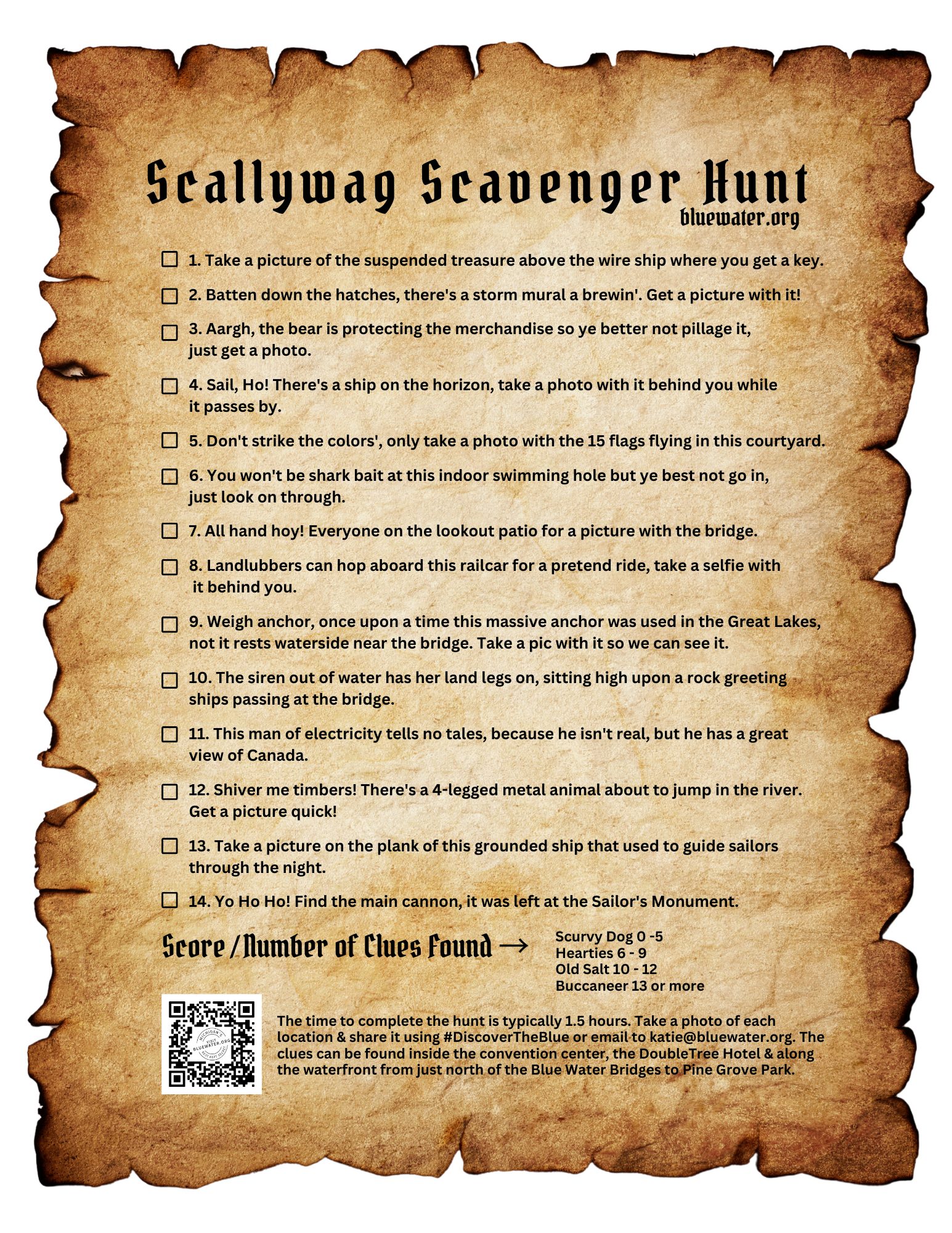 Ahoy! You can pick up the clues list at the Blue Water Area Convention & Visitors Bureau inside the Blue Water Convention Center, at the DoubleTree by Hilton's front desk or print the list of clues. Clues can be found at the Blue Water Convention Center, DoubleTree by Hilton and along the waterfront from the International Flag Plaza to Pine Grove Park. The hunt is brought to you by the Blue Water Area Convention & Visitors Bureau.